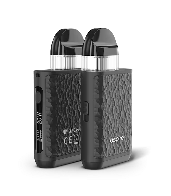 Aspire Minican 4 Plus Pod Mod, siyah, dokulu gövde, 20W ekranlı.