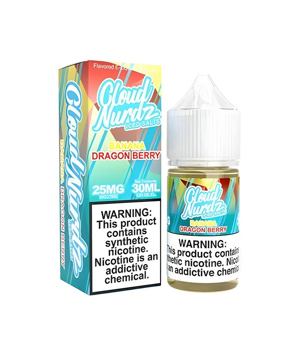 Cloud Nurdz Banana Dragon Berry Iced Salt Likit, olgun muz, ejder meyvesi ve karışık orman meyvelerini buz ferahlığıyla birleştirir. 30 mL, 25 mg / 50 mg nikotin seçenekleri, 60VG/40PG oranı.