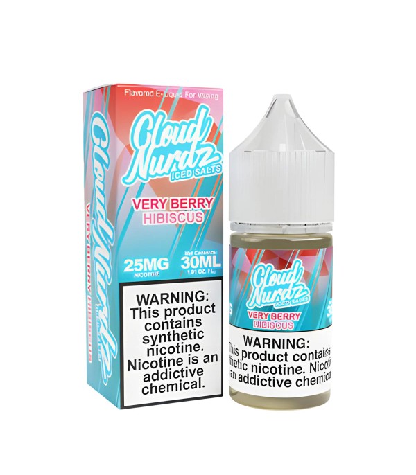 Cloud Nurdz Very Berry Hibiscus Iced Salt Likit, karışık orman meyveleri ve hibiskus çiçeği aromalarını buz ferahlığıyla buluşturur. 30 mL, 25 mg / 50 mg nikotin seçenekleri, 60VG/40PG oranı.