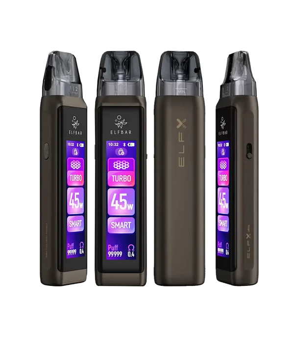 Elf Bar ELFX Pro Classic Edition Pod Mod kahverengi deri görünümlü ekranlı.