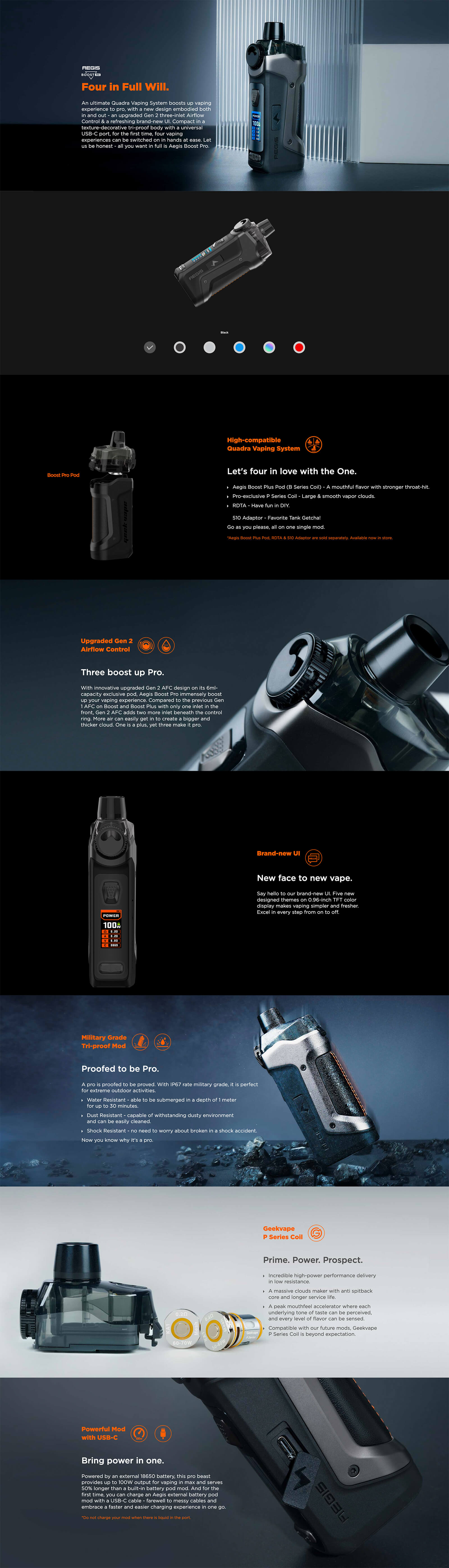 Geekvape Aegis Boost Pro Pod Mod, suya, toza ve darbeye karşı dayanıklılık sağlayan IP-67 derecesi ile zorlu koşullarda bile sağlam bir performans sunan bir pod mod cihazdır.
