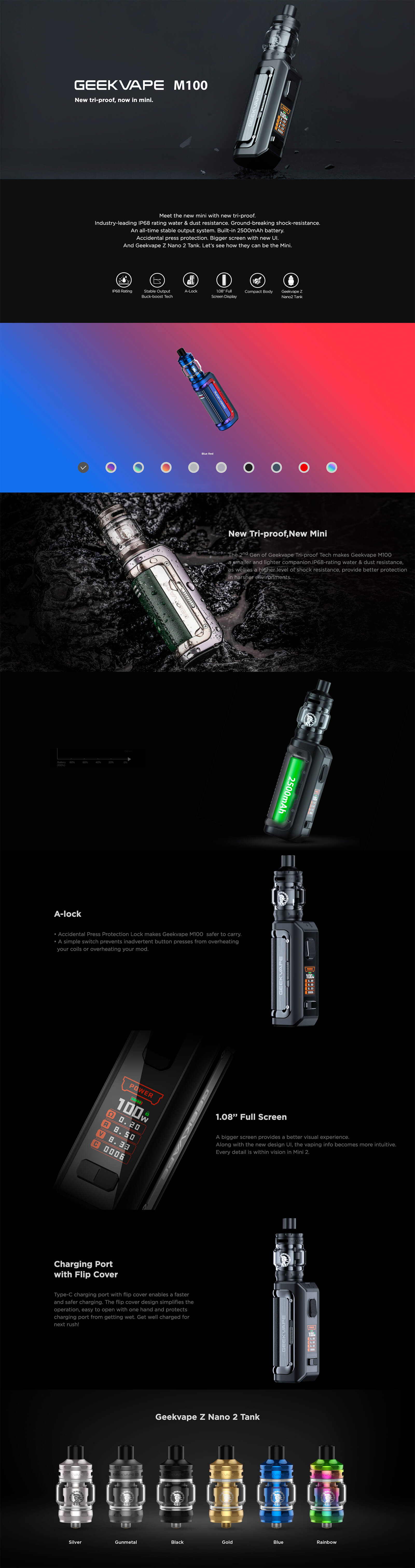 GeekVape Aegis Mini 2 Kit, yeni tri-proof teknolojisi ve Z (Zeus) Nano 2 Tank ile dayanıklılık ve uzun kullanım süresi sunan kompakt bir cihazdır. 2500mAh dahili bataryası sayesinde, uzun süre şarj etmeden kullanılabilir ve 100W maksimum çıkış gücü sağlar. Endüstri lideri IP68 dereceli su ve toz direnci ile dış koşullara tam dayanıklılık sunar. Şok direnci ile sağlam yapıya sahip olan cihaz, hem dayanıklılığı hem de güçlü performansı ile öne çıkar.