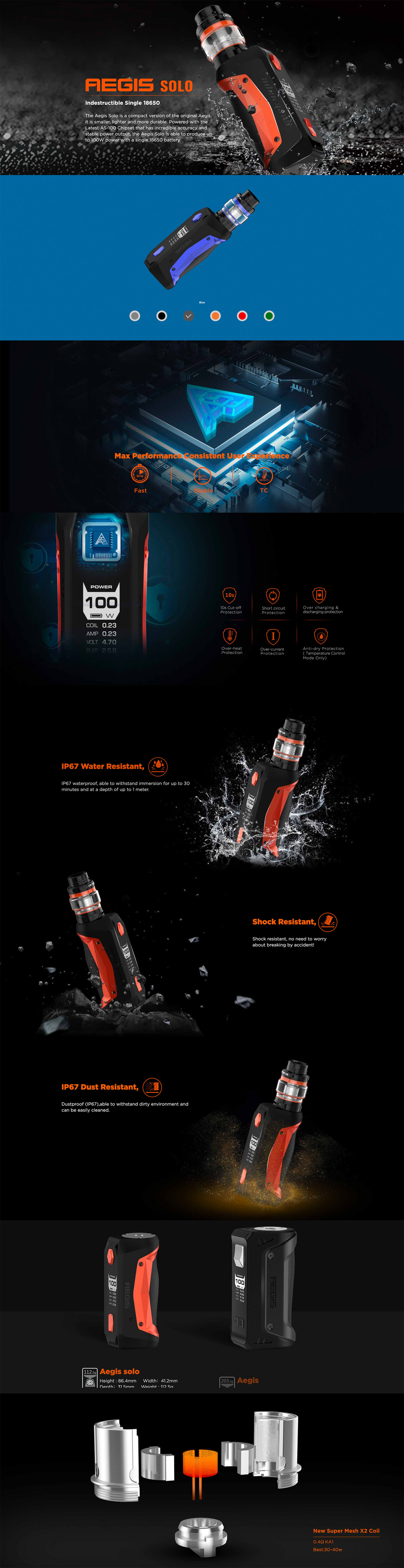 Geekvape Aegis Solo 100W Mod, serinin önceki modellerine kıyasla daha hafif ve kompakt bir tasarıma sahip olup, 18650 pil ile çalışan güçlü bir cihazdır.