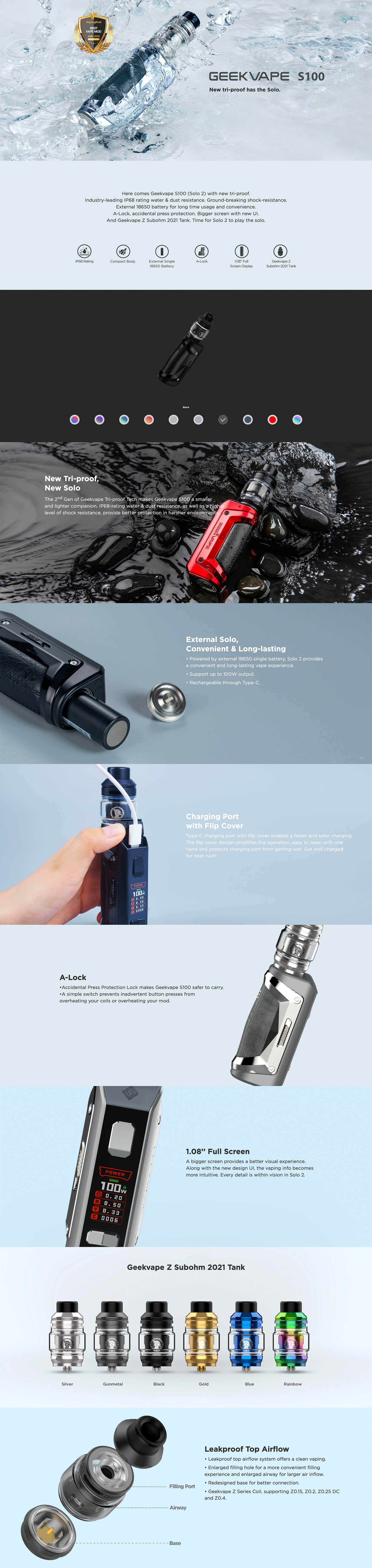 GeekVape Aegis Solo 2 Kit (S100), Z Subohm 2021 Tank ile donatılmış, güçlü ve dayanıklı bir mod kitidir. Bu kit, IP68 dereceli su ve toza dayanıklılık ve çığır açan şok direnci ile zorlu koşullara karşı mükemmel koruma sağlar. Harici 18650 pil ile çalışır ve 100W’a kadar çıkış gücü sunar. A-Lock özelliği sayesinde, yanlışlıkla ateşleme riskine karşı koruma sağlar. Daha büyük bir ekran ve yeni kullanıcı arayüzü ile donatılan cihaz, rahat ve kullanıcı dostu bir deneyim sunar. Z Subohm 2021 Tank ise 5.5ml kapasite sunarak uzun süreli kullanım sağlar.