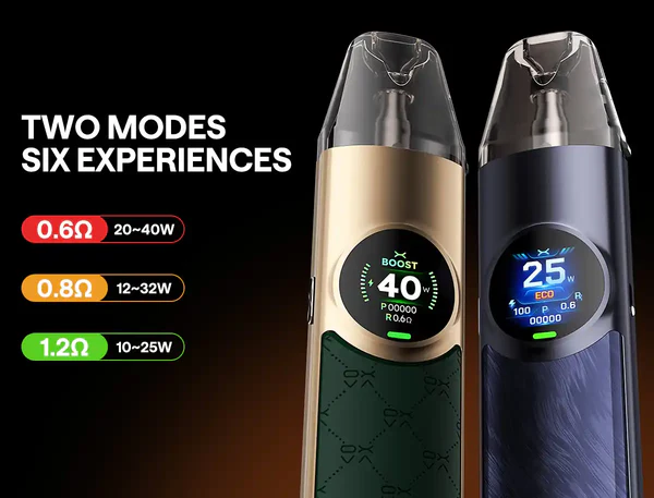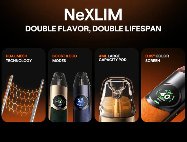 OXVA NeXlim Pod Vape Kit, 1500mAh bataryası, dual mesh coil seçenekleri (0.6 Ohm / 0.8 Ohm / 1.2 Ohm), Boost ve Eco modları ile hem aroma hem buhar performansını arayanlar için dengeli bir cihazdır. Kaydırılabilir hava akışı, sızdırmaz pod sistemi ve renkli ekran ile pratik kullanım ve görsel çekicilik sağlar.