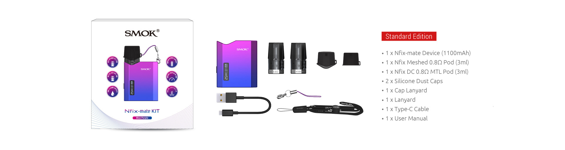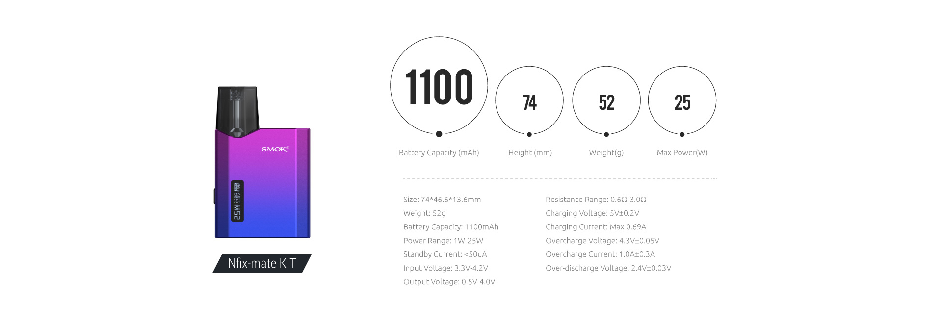 SMOK Nfix-mate Pod Mod, dahili 1000 mAh bataryası sayesinde 1-25 watt arasında ayarlanabilir çıkış gücüne sahiptir.