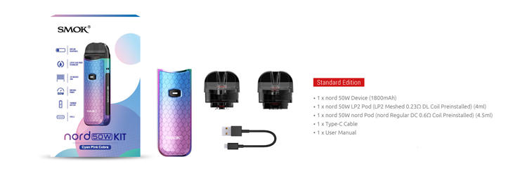 • 1 x Nord 50W LP2 Pod (LP2 Meshed 0.23 Ohm DL Coil ile önceden yüklenmiş) (4ml kapasiteli)