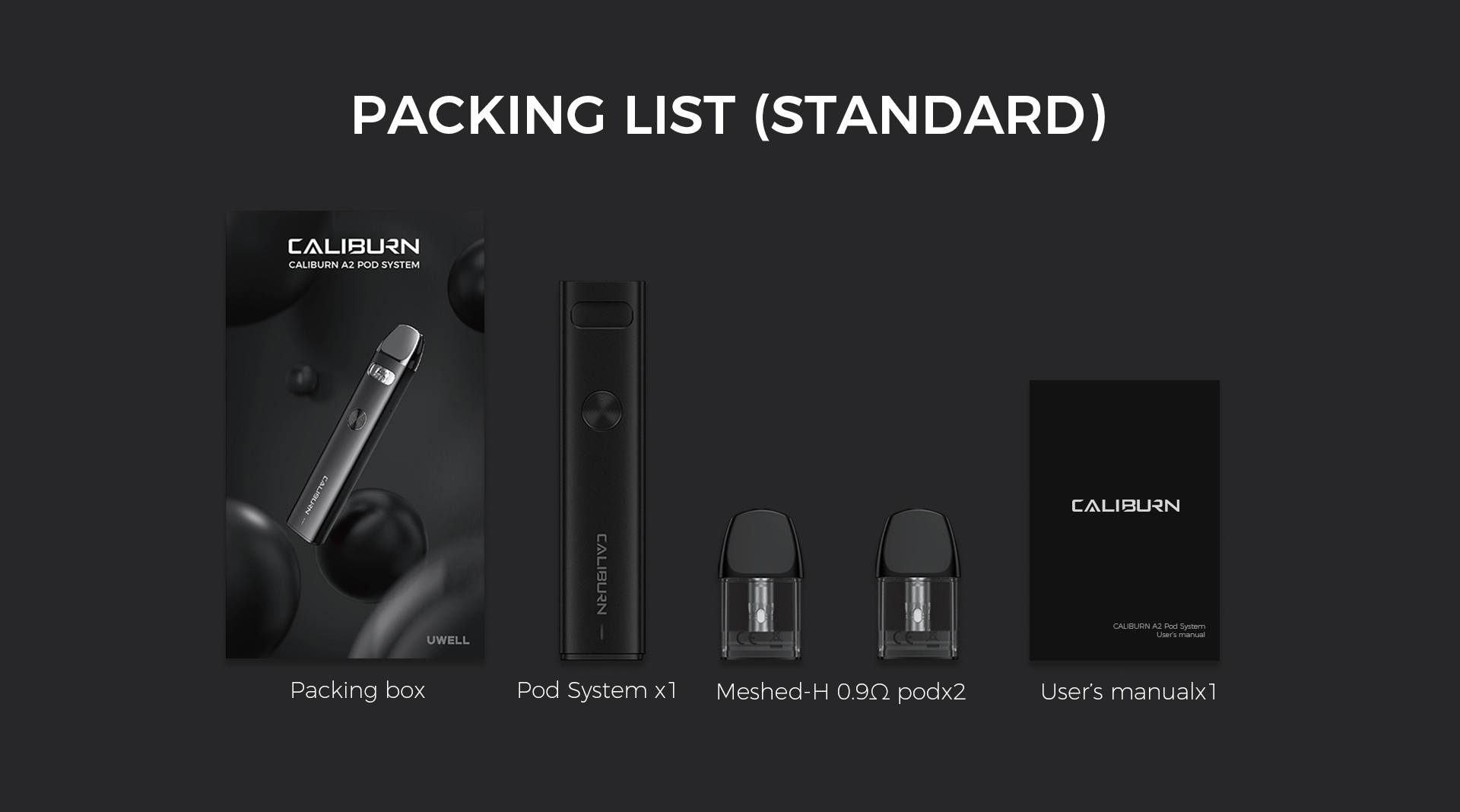 Uwell Caliburn A2: 520mAh pil, 2ml tank, 0.9/1.2 Ohm coil. Çekim aktifleştirme, USB-C şarj. Dayanıklı, kompakt, lezzetli elektronik sigara deneyimi.
