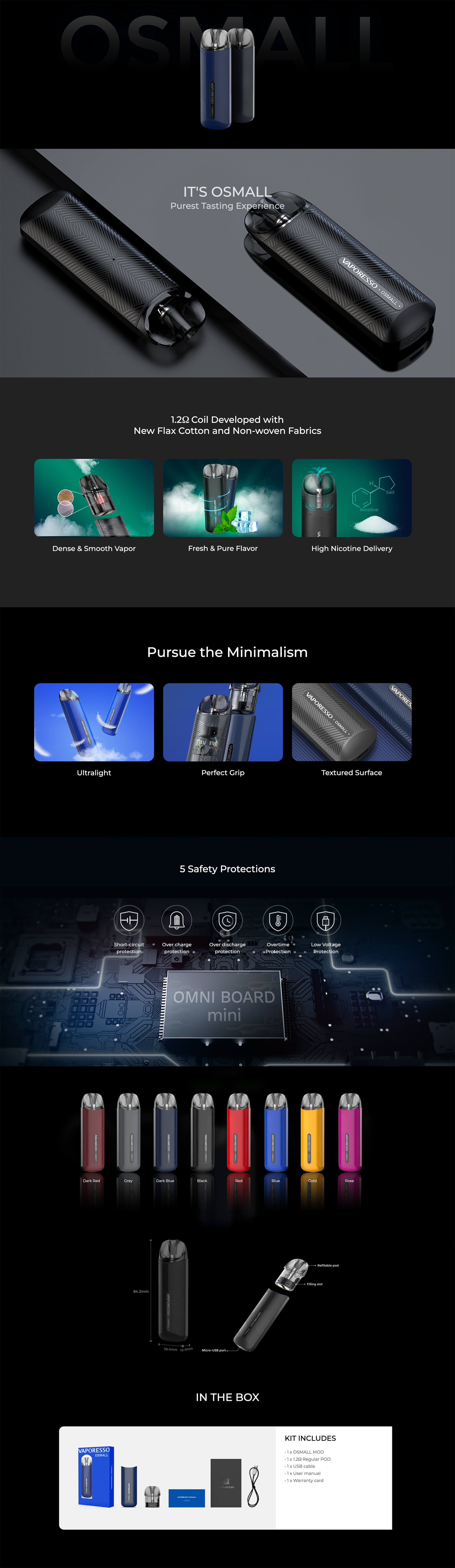 Vaporesso firmasının minifit cihazına muadil olarak üretmiş olduğu Vaporesso Osmall Pod Mod karşınızda. Ufak ve kibar tasarımı ile oldukça beğenilen ve işlevi oldukça yeterli olarak üretilen Vaporesso Osmall Pod Mod 11w güce kadar çıkabilen tam bir pod elektronik sigaradır.350Mah dahili pili ile ve 2ml tank kapasitesi ile yeterli bir yapıya sahip olarak üretilmiştir.