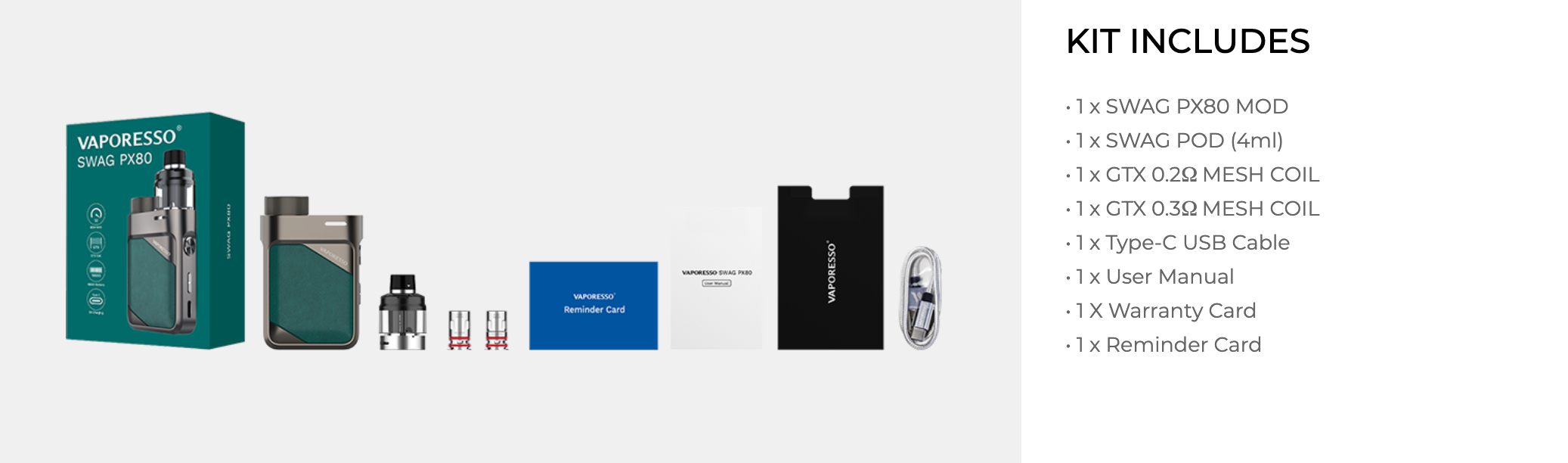 Vaporesso Swag PX80 Pod Seti kompakt gövdesiyle en 80W pod kiti. Vaporesso Swag PX80 Kit, IML ekranını dokulu kapağın altında mükemmel bir şekilde gizleyerek gömülü IML ekranı benimser. Tek bir 18650 pil ile Vaporesso Swag PX80 Pod Sistemi, 5-80W ayarlanabilir watt sağlayabilir. AXON CHIP özelliğine sahip olan Vaporesso Swag PX80 cihazı 0.001 saniye anlık ateşleme performansı sunar. Çeşitli koruma fonksiyonları ile Vaporesso Swag PX80 cihazını endişelenmeden kullanabilirsiniz. Ek olarak,  Vaporesso Swag PX80 Pod , 4ml likit kapasitesi ve GTX 0.2 Ohm Mesh Coil / GTX 0.3 Ohm Mesh Coil ile birlikte gelir. Antibakteriyel keten pamuğu ve dokumasız kumaşı entegre eden GTX coilleri, herhangi bir sapma olmaksızın saf tadı pürüzsüzce sunar. GTX coilleri ve SWAG PX80, çekim sırasında anında ultra pürüzsüz lezzet sunmak için sorunsuz bir şekilde çalışır.