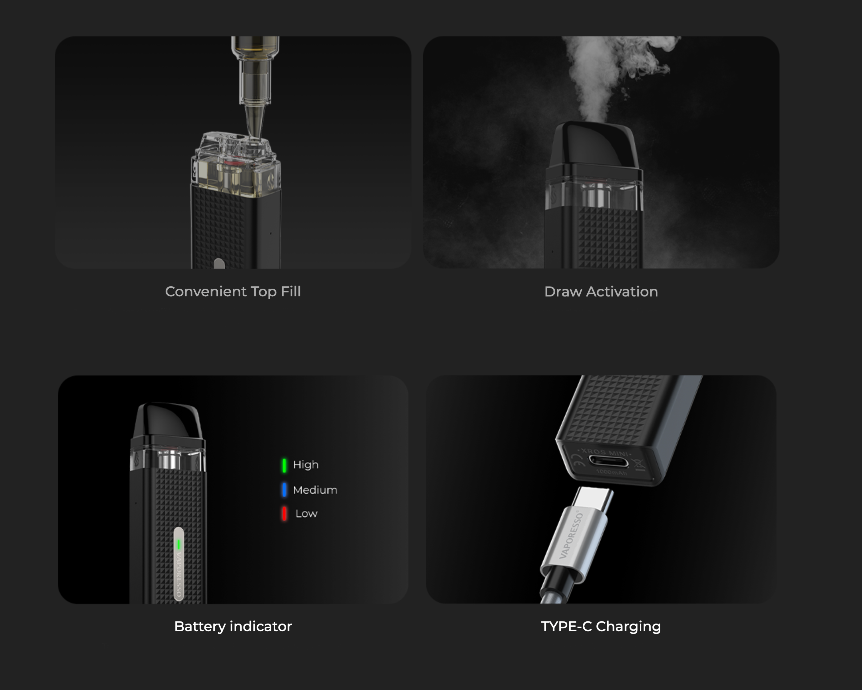 Vaporesso XROS Mini Pod, Vaporesso XROS ailesinin en yeni üyesidir ve günlük kullanım için mükemmel bir MTL (Ağızdan Akciğere) buhar deneyimi sunar. Cihaz, 1000mAh yerleşik pil kapasitesine sahip olup, yaklaşık 2 günlük kullanım süresi sunar. Ayrıca 5V/1A USB Type-C hızlı şarj desteği sayesinde hızlıca şarj edilebilir. Lüks elmas desenli yüzeyi ile kusursuz bir tutuş sağlar ve elden kayma ihtimalini en aza indirir. SSS Sızıntıya Dayanıklı Teknoloji ile donatılmış olan Vaporesso XROS Mini Pod, tüm Vaporesso XROS Kartuşları ile uyumludur.
