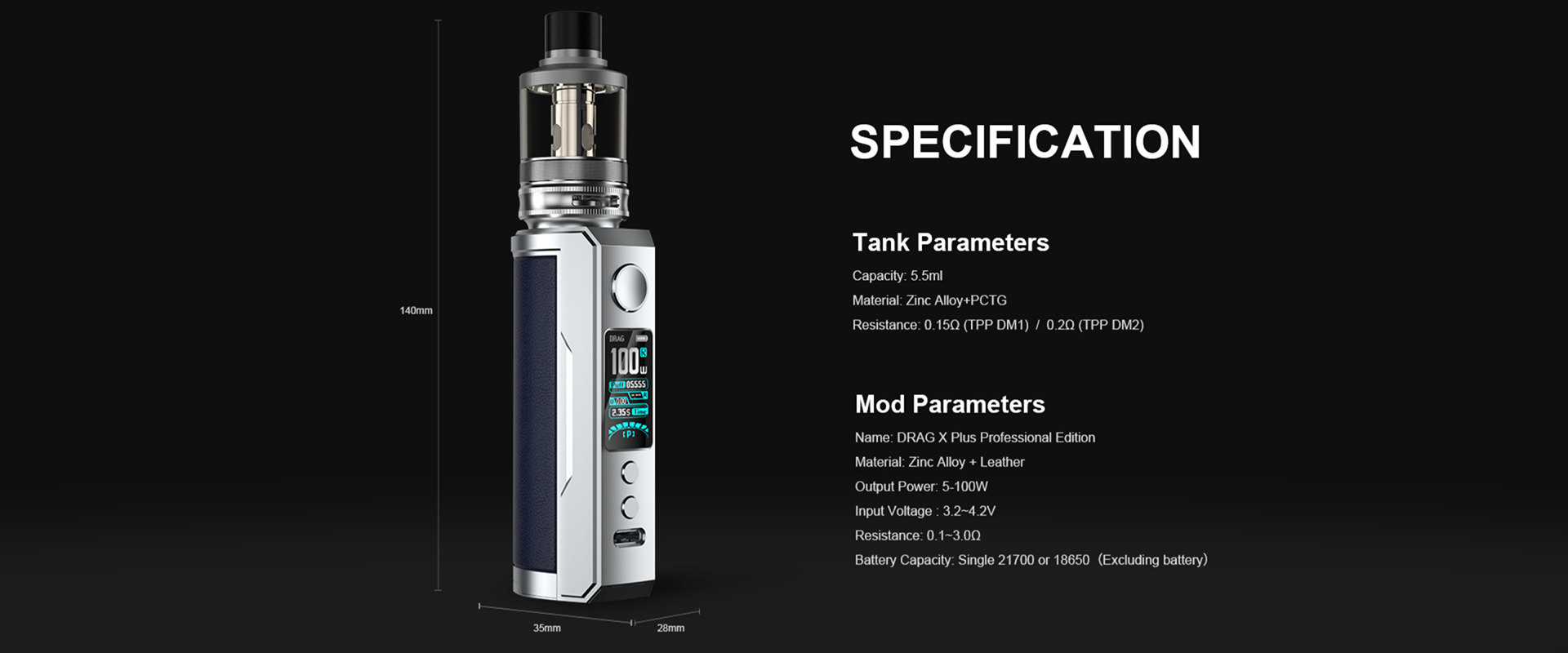 Voopoo Drag X Plus Pro, deri ve metalin klasik tasarımını sürdüren şık bir pod mod olup, GENE.FAN 2.0 çipi ile maksimum 100W çıkış gücü sunar.
