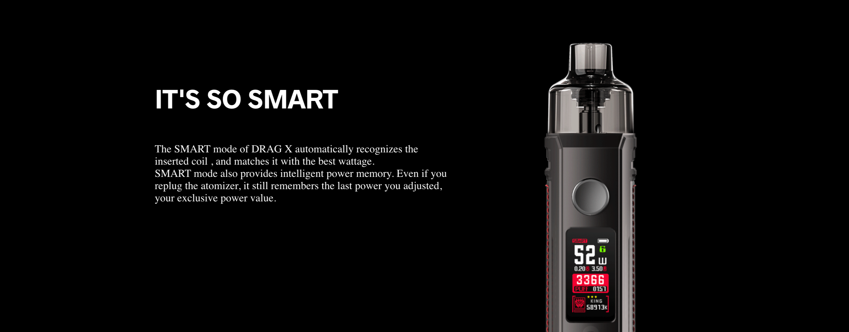 DRAG'ın klasik sembolü, son derece hızlı ikinci emiştir, DRAG X bu soyu devam ettirir. Yeni GENE.TT yongası, 0.001 saniyelik bir ateşleme hızı ve 80W'a kadar güçlü bir çıkış ile daha büyük lezzetli buhar yapmanızı sağlar.