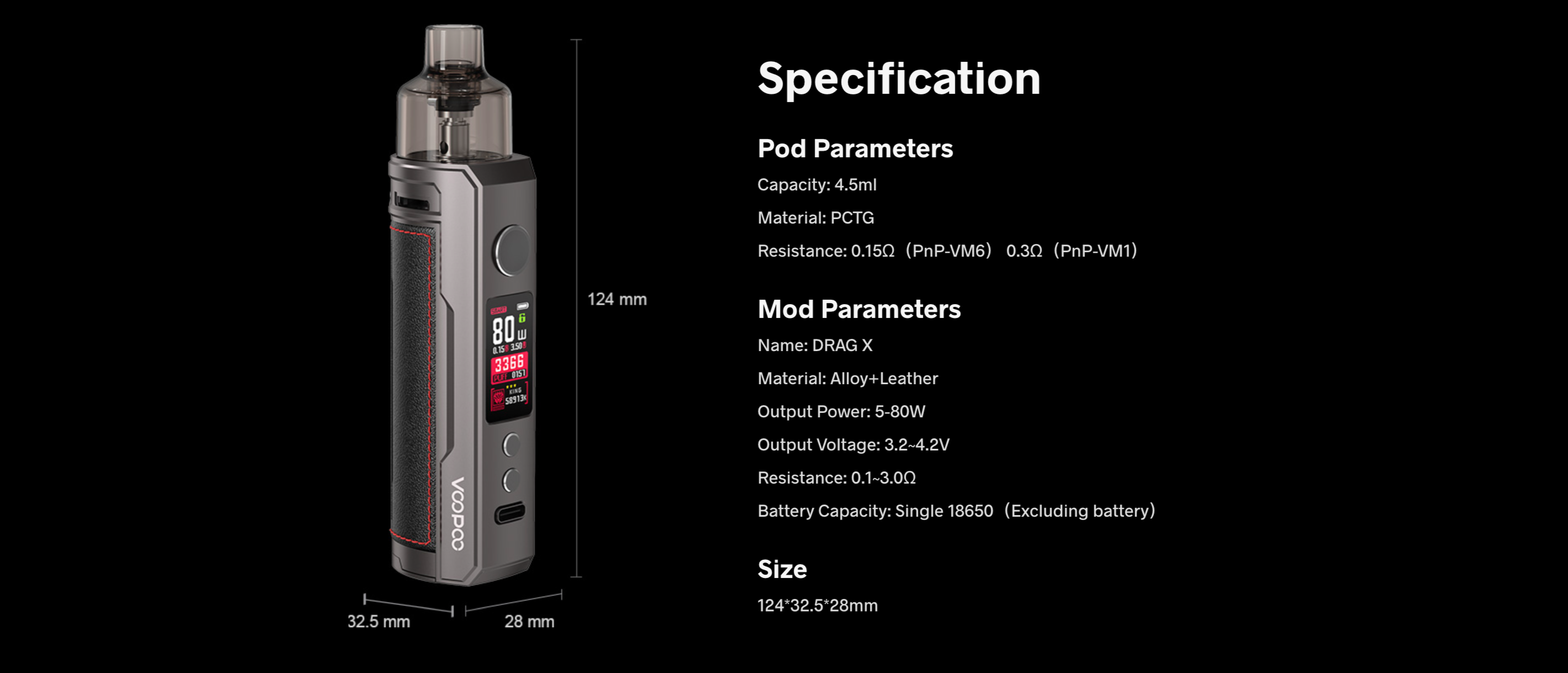 Voopoo Drag X Pod Mod bir adet 18650 harici pil ile çalışmaktadır. Tip-C ile güç kaygısından uzak hızlı şarj olma özelliğine sahiptir. 5W ile 80W arası ayarlanabilir güç modu 0.001s aşırı ateşleme sağlayan yeni nesil GENE.TT çip seti ile donatılmıştır. Kartuşu 4.5ml’lik büyük bir likit kapasitesi ve yenilikçi hava akış sistemiyle üretilmiştir.