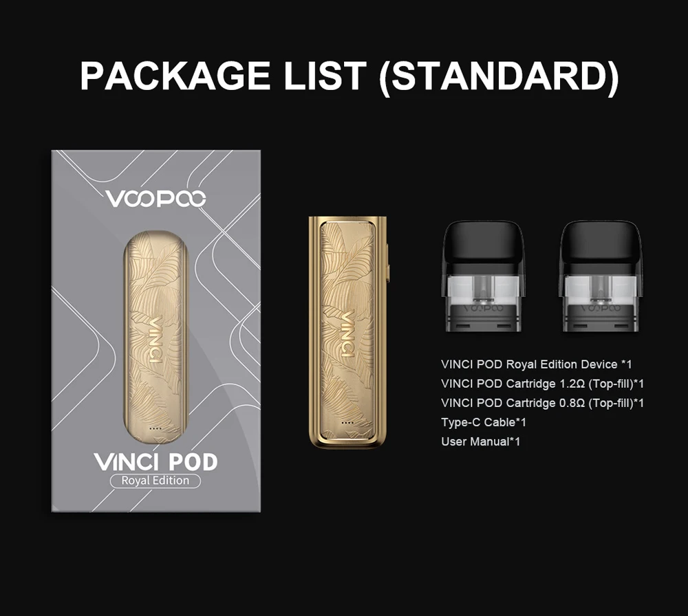 VINCI Pod Kit Royal Edition, yalnızca VINCI Pod'un taşınabilir görünümünü miras almakla kalmıyor, aynı zamanda 6061 alüminyum alaşımından oluşan havacılık malzemesiyle birlikte klasik kabartma heykel teknolojisini de kullanıyor. VINCI Pod Kit Royal Edition, 11-15W güç aralığına sahip 800mAh dahili pile sahiptir. 2ml kapasiteli, üstten doldurulabilir görünür kartuşla donatıldığından, yeniden doldurmanız kolaydır. VINCI Pod Kit Royal Edition'a yükseltilmiş sızıntıya karşı dayanıklılık işlevi uygulanmıştır. Pakette iki bölme bulunmaktadır: örgü 0.8 Ohm bölme ve örgü 1.2 Ohm bölme. Ayrıca VINCI Pod Kit Royal Edition, Vinci Q, Drag Nano 2 ve Vinci Pod kartuşlarıyla uyumludur.
