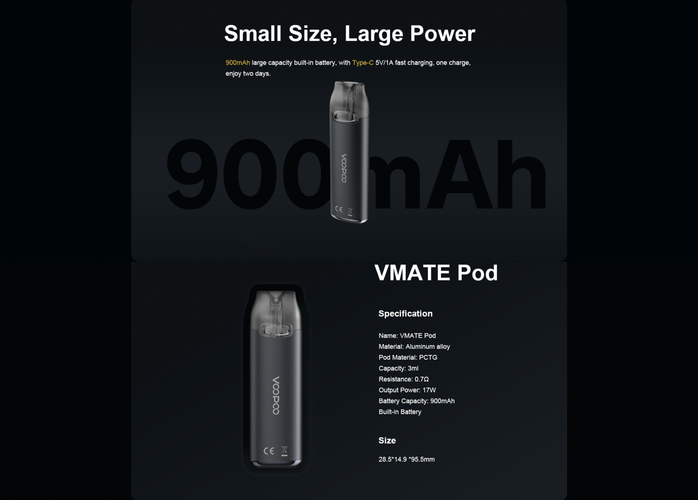 Voopoo VMate Pod Mod, 17 watt çıkış gücü, 3ml likit kapasitesi ve 900mAh’lık dahili bataryasıyla, günlük kullanımda en iyi performansı sunacak şekilde tasarlanmış kompakt bir pod moddur.
