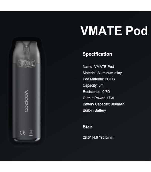Voopoo VMate Pod Mod, 17 watt çıkış gücü, 3ml likit kapasitesi ve 900mAh’lık dahili bataryasıyla, günlük kullanımda en iyi performansı sunacak şekilde tasarlanmış kompakt bir pod moddur.